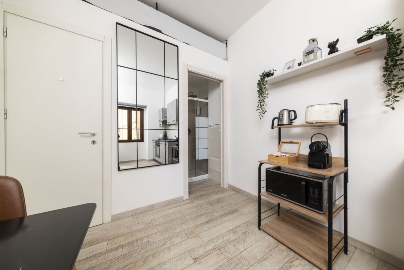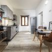 La cucina completamente attrezzata mette a disposizione piano cottura Candy, forno tradizionale, microonde Samsung con grill, frigorifero con freezer, bollitore, tostapane e un set completo di pentole, piatti e posate, ideale per sentirsi davvero a casa, anche in vacanza.