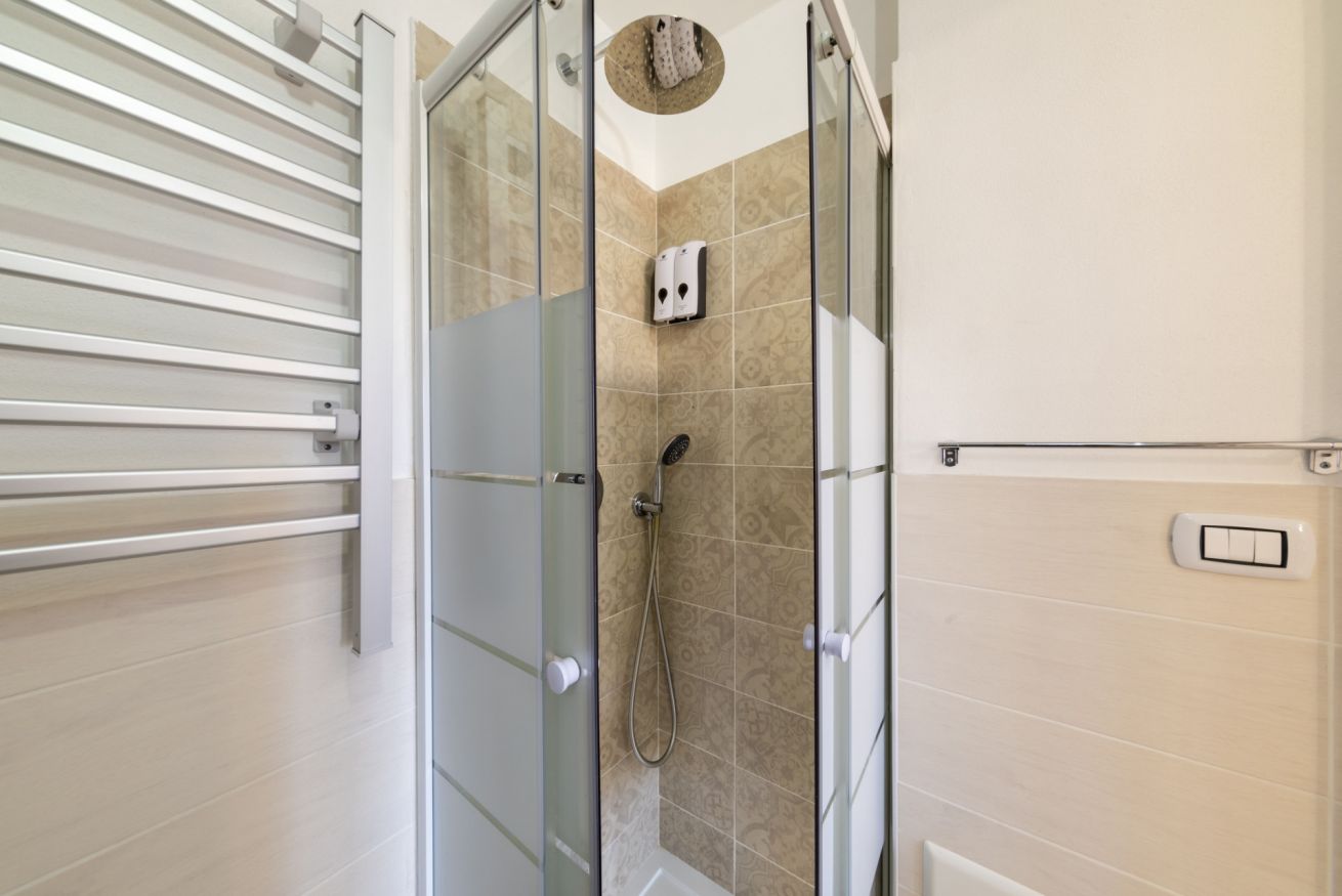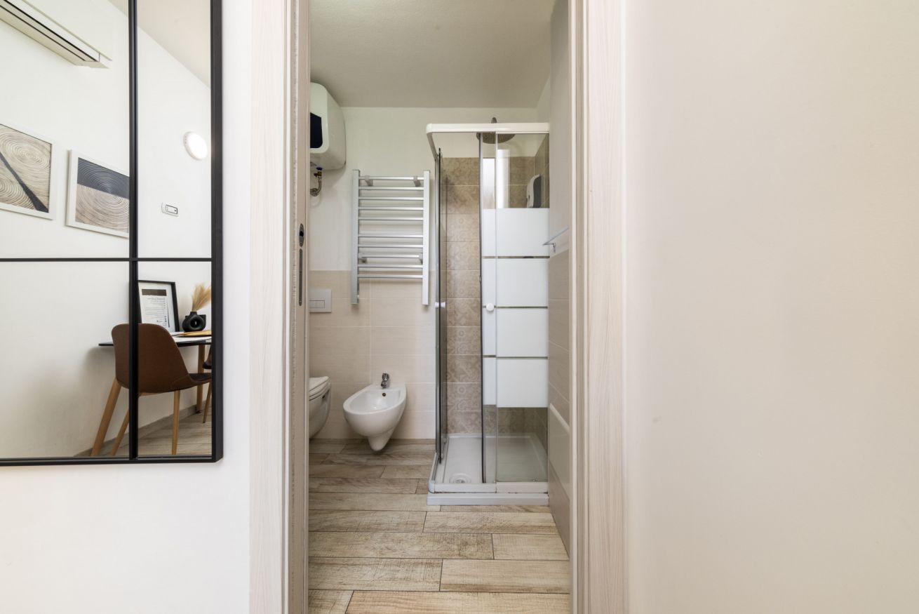 Il bagno moderno, curato nei minimi dettagli, offre una cabina doccia ampia con soffione e doccetta, asciugacapelli, scaldasalviette e sanitari sospesi WC e bidet. Incluso un Kit Cortesia per iniziare il soggiorno nel migliore dei modi.